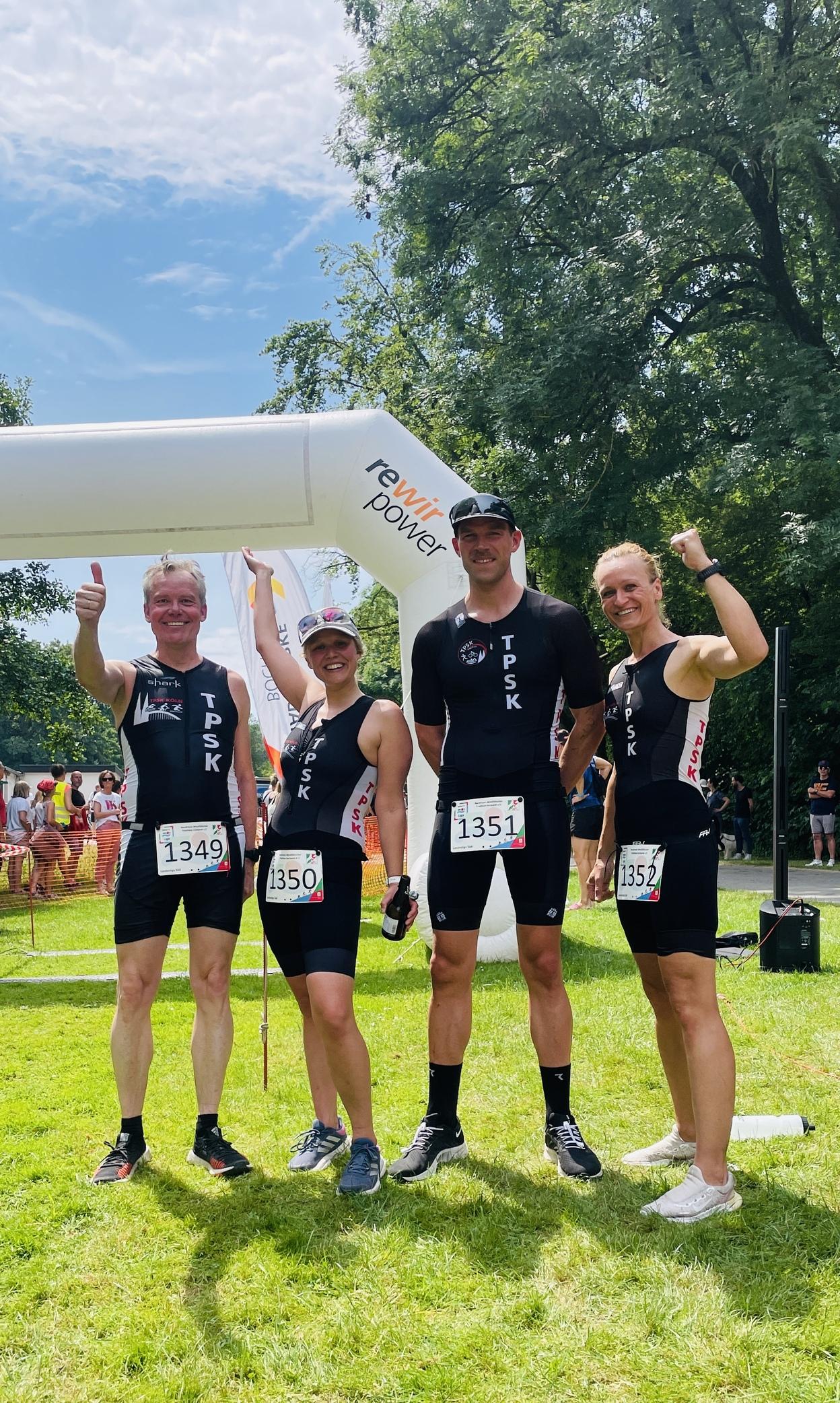 In Krefeld folgten am 20. August 750 Metern Schwimmen im Elfrather See 20 Kilometer auf einer flachen Radstrecke, die letztlich zurück zum See führten, an dessen Ufer die finalen 5 Kilometer zu absolvieren waren. Durch den späten Start hatte die Sonne schon Kraft gewonnen, als Ina, Karo, Holger und Sebastian – lautstark unterstützt von Jörg und Aron an der Strecke - die TPSK-Farben sicher ins Ziel trugen. Im Gegensatz dazu warteten am Morgen des 11. September in Ratingen 400 Meter Schwimmen im Freibadbecken, von wo es auf die hügelige Radrunde ging. Auf den abschließenden Laufrunden wurden Sabine, Alex, Holger und Johannes nochmal von Sebastian angefeuert, bevor sie den letzten Zielstrich der Liga-Saison überquerten.