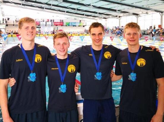 4 x 200m Freistil-Staffel, die neuen TPSK-Vereinsrekord schwamm und damit den 8. Platz in der deutschen Staffelwertung errang. Dabei brachte sein Bruder Julian mit 1:56,70 min eben-falls eine hervorragende persönliche Bestzeit ins Wasser und auch die beiden weiteren TPSK-Asse Alexander Menzel und Oliver Mohs blieben klar unter der 2 min-Marke.