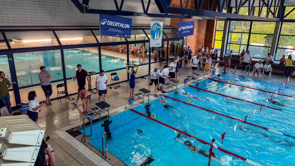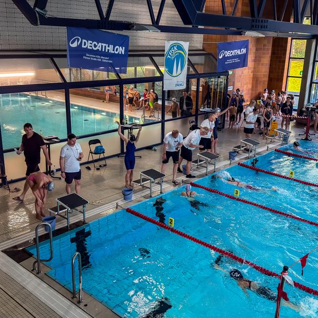 Bei unseren Kinder-Schwimmfesten liegt unser Fokus auf den jüngsten Aktiven. Hier geht es (noch) nicht um Quali-Zeiten, sondern darum, Wettkampferfahrung zu sammeln. Für viele Schwimmerinnen und Schwimmer ist es der erste Wettkampf, an dem sie teilnehmen. Das Chorweilerbad bietet dafür einen schönen Rahmen: ein kleines 6-Bahn-Wettkampfbecken und jede Menge Platz für Zuschauer, so dass auch Eltern und Großeltern live dabei sein können.